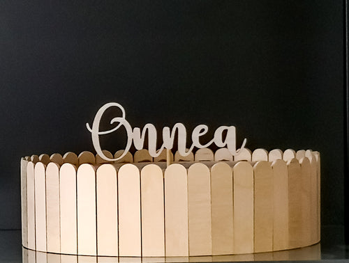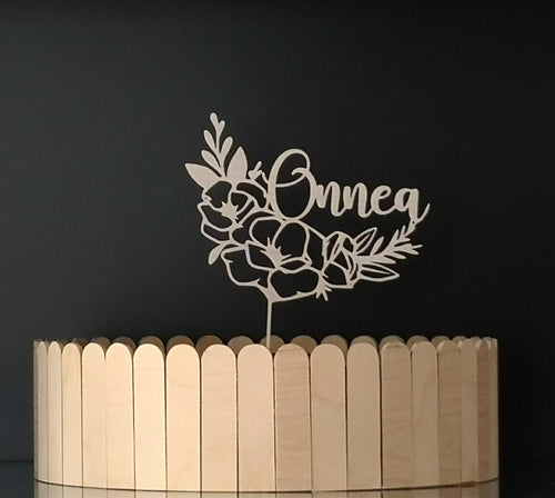 Kakkukoriste onnea -tekstillä ja kukkakoristeella
